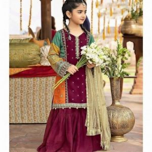 Elegant premium-quality kids sharara set crafted with rich embroidery and soft fabric. Perfect for festive occasions, weddings, and special events, offering comfort with a royal ethnic look