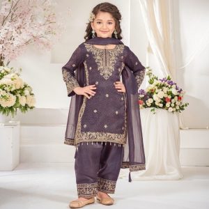 Royal Purple & Sea Green Girls’ Silk Embroidered Salwar Kameez Set