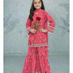 Elevate her festive wardrobe with this stunning 3-piece Gharara ensemble. Crafted in a vibrant rose pink hue, this set features intricate silver-tinsel embroidery, delicate lace detailing, and a classic flared silhouette designed for grace and movement