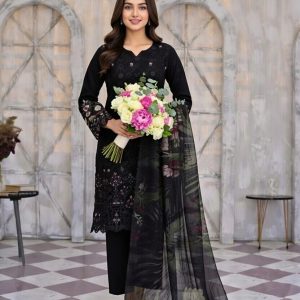 A stunning jet-black silhouette featuring intricate floral embroidery, delicate laser-cut lace detailing, and a breathtaking digital-print organza dupatta. Elegant, timeless, and crafted for comfort