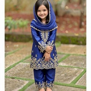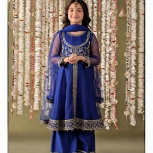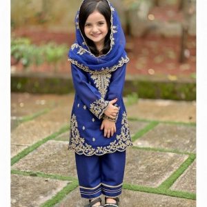 A luxurious royal blue ensemble adorned with intricate gold embroidery, designed to bring elegance and charm to your little one’s festive moments.