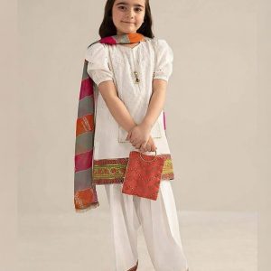 A breath of fresh air in traditional wear. This pristine white Schiffli cotton kurta features delicate eyelet embroidery, paired with a vibrant multi-colored striped dupatta and classic tulip-style shalwar. Perfect for festive gatherings where elegance meets playful charm