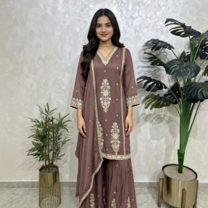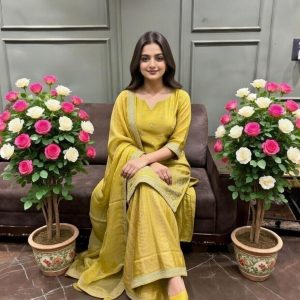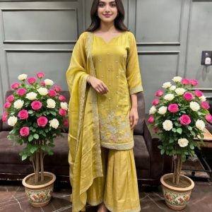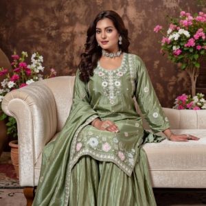 Exude timeless elegance in this Sage Green Premium Silk Sharara Set. Featuring intricate floral threadwork and a lustrous metallic finish, this ensemble is designed for the modern woman who cherishes traditional craftsmanship. The set includes a straight-cut kurta, voluminous pleated sharara bottoms, and a matching dupatta with delicate border detailing