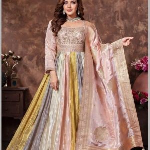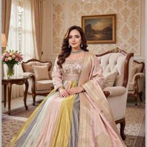 A masterpiece of modern ethnic luxury. This floor-length Anarkali features a unique multi-tonal pleated skirt in shades of dusty rose, sage, and burnished gold. Paired with a meticulously hand-embroidered bodice and a heavy Banarasi silk dupatta, it is the definitive choice for the modern bride or the quintessential festive gala