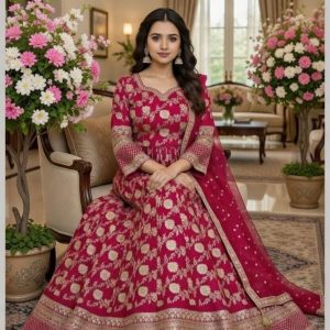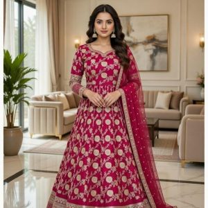 Step into timeless elegance with our Rani Pink Silk Anarkali Gown. Melding traditional Banarasi craftsmanship with a contemporary floor-length silhouette, this masterpiece features intricate champagne-gold floral motifs and a grand woven border. A perfect ensemble for weddings, galas, and festive celebrations