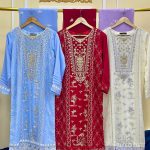 Crafted from premium soft organza fabric, the dress offers a lightweight, breathable, and luxurious feel. The front panel features intricate hand-style embroidery with delicate botanical and heritage patterns, beautifully complemented by detailed borders and finely embellished sleeves. The rich color palette — available in royal red, powder blue, and soft ivory — enhances its regal charm while maintaining a refined, feminine appeal.
