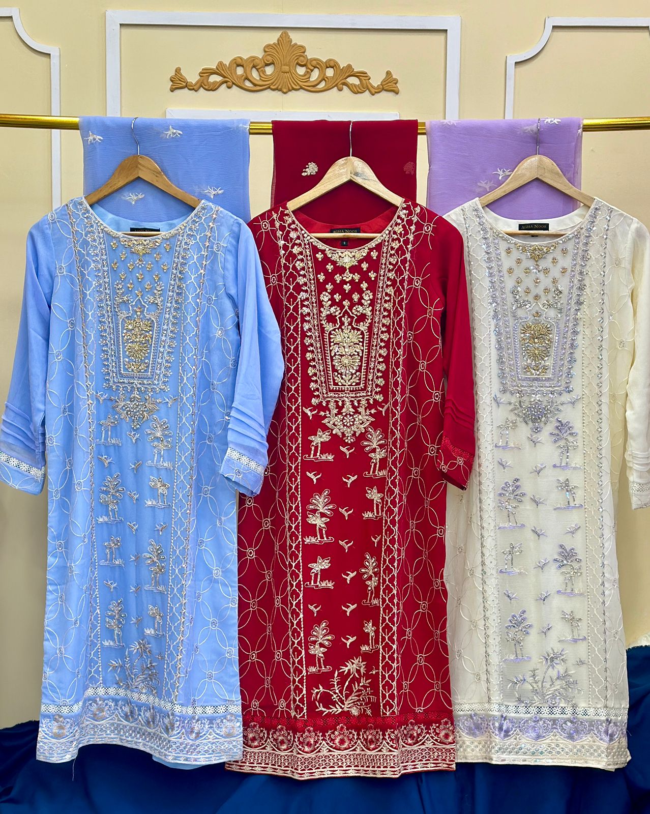 Crafted from premium soft organza fabric, the dress offers a lightweight, breathable, and luxurious feel. The front panel features intricate hand-style embroidery with delicate botanical and heritage patterns, beautifully complemented by detailed borders and finely embellished sleeves. The rich color palette — available in royal red, powder blue, and soft ivory — enhances its regal charm while maintaining a refined, feminine appeal.