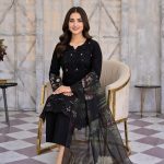 • The Kameez (Shirt): The shirt features a deep jet-black canvas adorned with exquisite pink and sage green floral embroidery along the neckline and sleeves. The hemline is finished with high-end laser-cut organza borders and delicate lacework, adding a touch of contemporary flair to the traditional design.