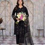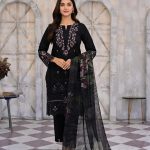 • The Dupatta: The highlight of this set is the translucent, lightweight dupatta. It showcases a moody, large-scale botanical print that flows effortlessly, providing a dramatic contrast to the solid black base of the suit.