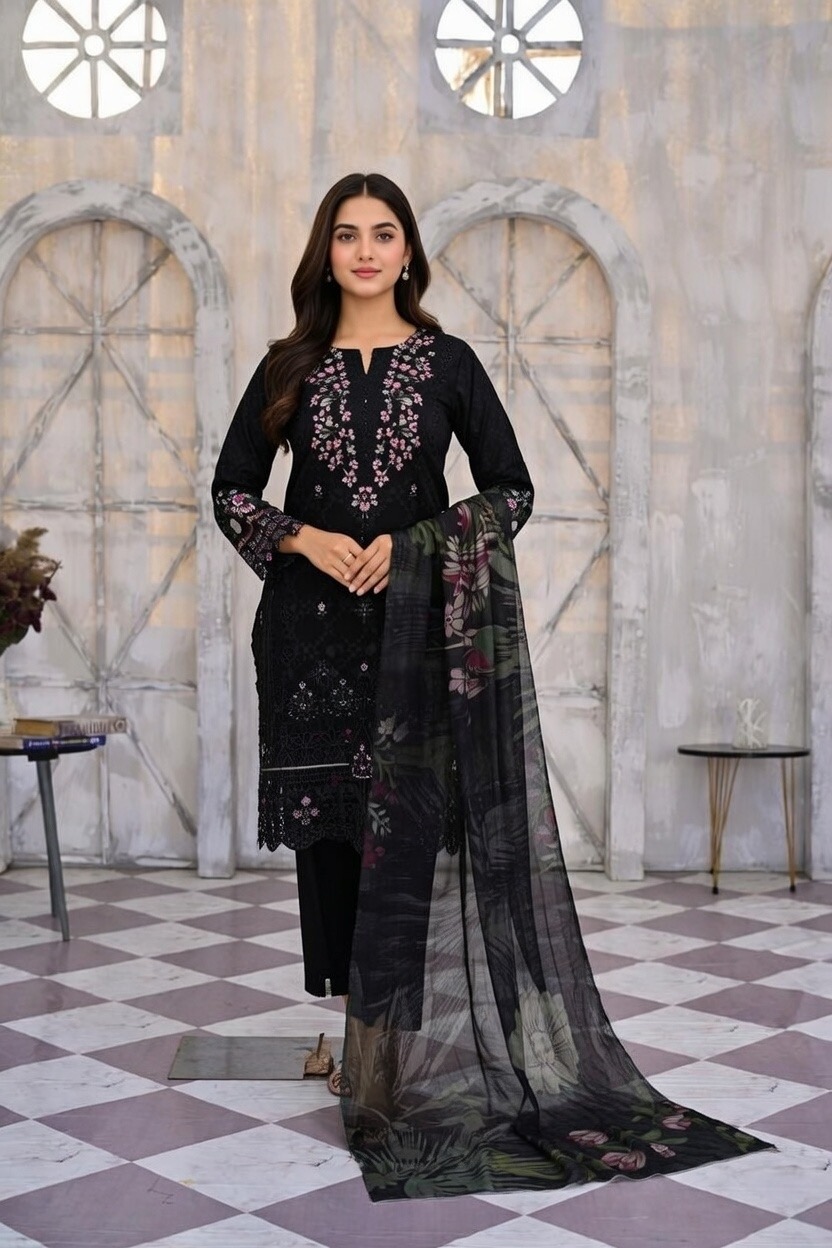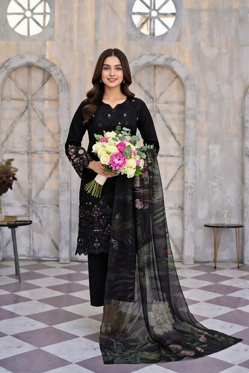 • The Dupatta: The highlight of this set is the translucent, lightweight dupatta. It showcases a moody, large-scale botanical print that flows effortlessly, providing a dramatic contrast to the solid black base of the suit.