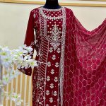 Step into elegance with this stunning royal crimson ensemble featuring intricate golden thread and sequin embroidery. The front-open style shirt is beautifully adorned with traditional motifs and delicate detailing, creating a luxurious festive look. Paired with a lightweight net dupatta enhanced with subtle golden lattice work, this outfit is perfect for weddings, festive gatherings, and formal occasions. A timeless blend of grace and sophistication designed to make you stand out.