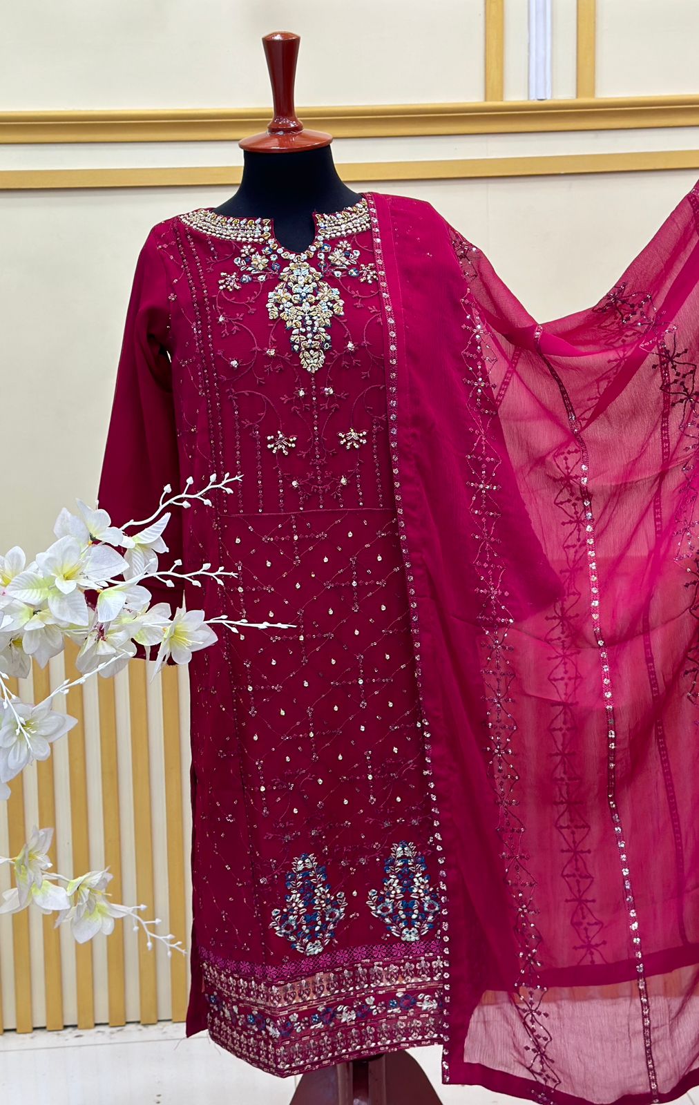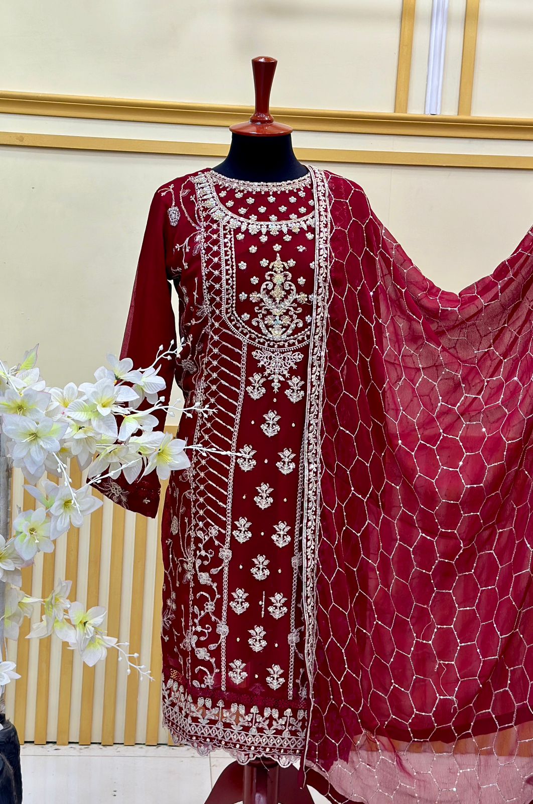 Step into elegance with this stunning royal crimson ensemble featuring intricate golden thread and sequin embroidery. The front-open style shirt is beautifully adorned with traditional motifs and delicate detailing, creating a luxurious festive look. Paired with a lightweight net dupatta enhanced with subtle golden lattice work, this outfit is perfect for weddings, festive gatherings, and formal occasions. A timeless blend of grace and sophistication designed to make you stand out.