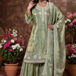 Exude timeless elegance in this Sage Green Premium Silk Sharara Set. Featuring intricate floral threadwork and a lustrous metallic finish, this ensemble is designed for the modern woman who cherishes traditional craftsmanship. The set includes a straight-cut kurta, voluminous pleated sharara bottoms, and a matching dupatta with delicate border detailing