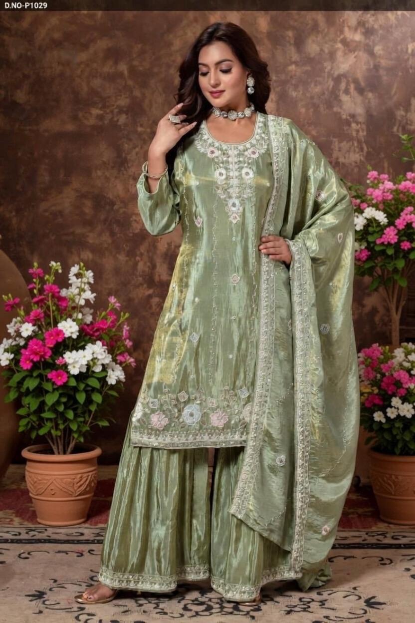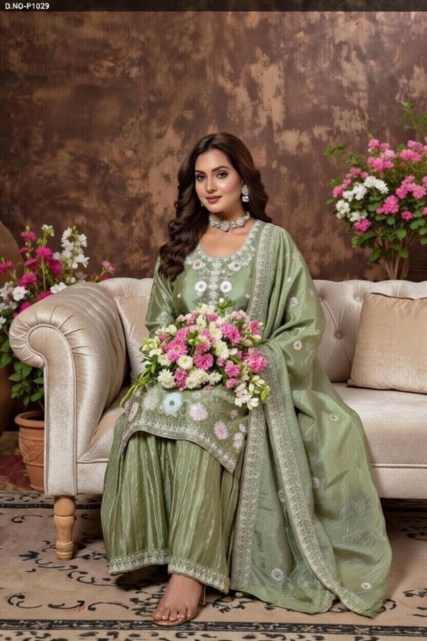 Exude timeless elegance in this Sage Green Premium Silk Sharara Set. Featuring intricate floral threadwork and a lustrous metallic finish, this ensemble is designed for the modern woman who cherishes traditional craftsmanship. The set includes a straight-cut kurta, voluminous pleated sharara bottoms, and a matching dupatta with delicate border detailing