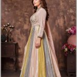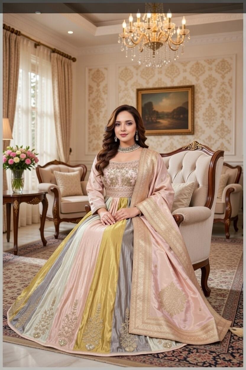 Elevate your presence with a silhouette that defines grace. This premium Anarkali gown is engineered with a structured bodice and a voluminous flared skirt. The skirt utilizes alternating panels of premium silk, creating a shimmering vertical play of light that elongates the frame and offers a mesmerizing “twirl” factor